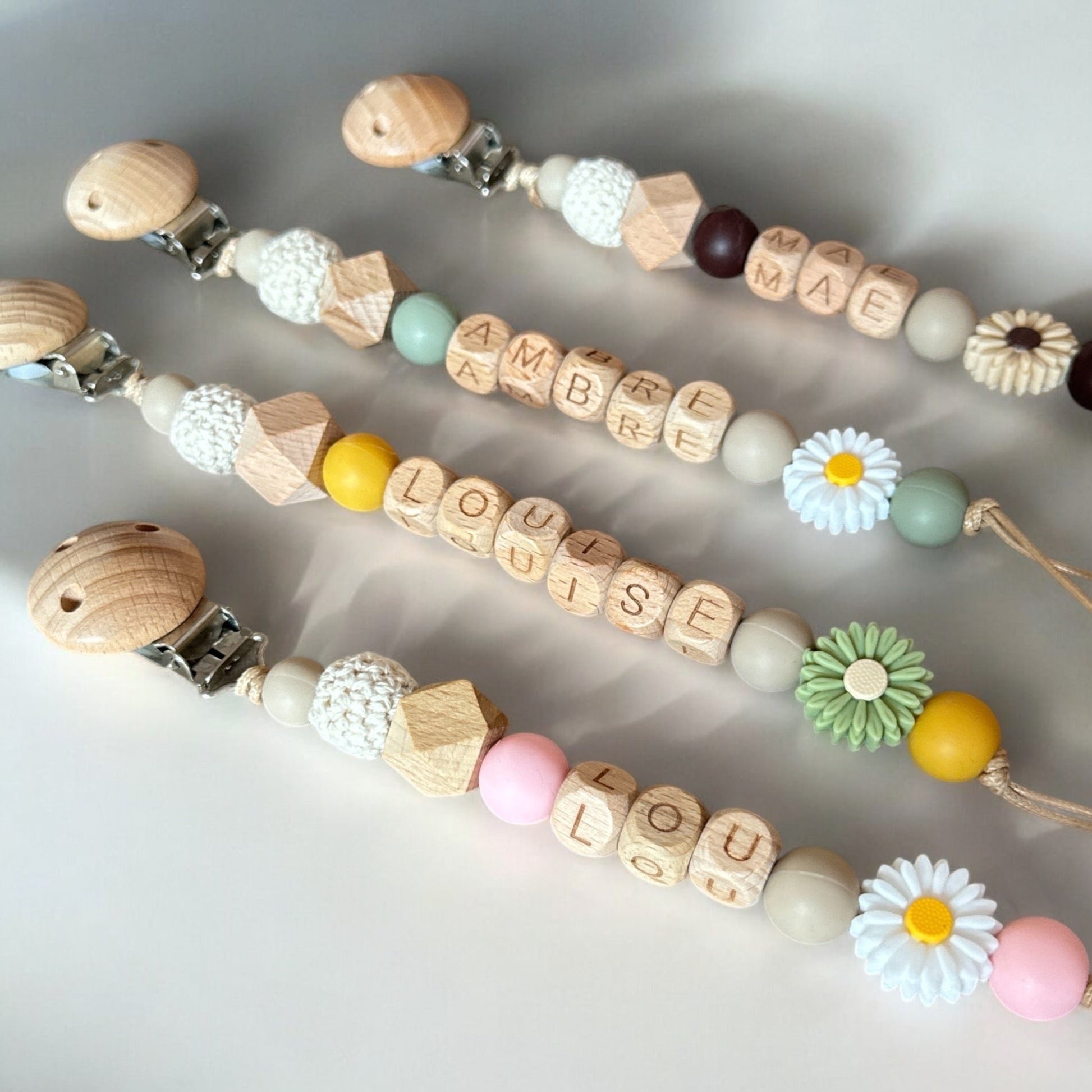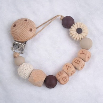 Attache tétine personnalisée fleurie : bois et silicone